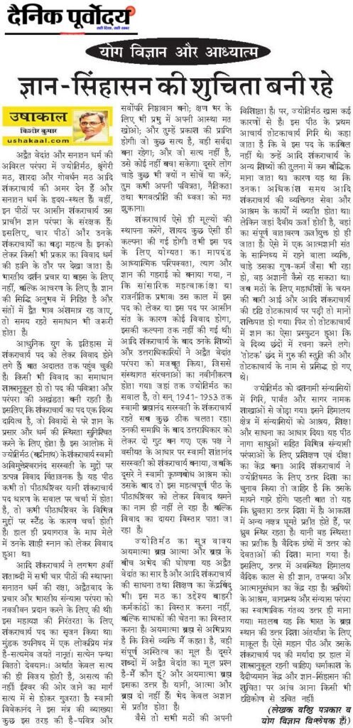 अद्वैत वेदांत और सनातन धर्म की अविरल परंपरा में ज्योतिर्मठ, श्रृंगेरी मठ, शारदा और गोवर्धन मठ आदि शंकराचार्य की अमर देन हैं और सनातन धर्म के हृदय-स्थल हैं। वहीं, इन पीठों पर आसीन शंकराचार्य उस प्राचीन ज्ञान परंपरा के संरक्षक हैं। इसलिए, चार पीठों और उनके शंकराचार्यों का बड़ा महत्व है। इनको लेकर किसी भी प्रकार का विवाद धर्म की हानि के तौर पर देखा जाता है। भारतीय दर्शन प्रचार या बहस के लिए नहीं, बल्कि आचरण के लिए है। ज्ञान की सिद्धि अनुभव में निहित है और संतों में द्वैत भाव अंशमात्र रह जाए तो समय रहते समाधान भी जरूरी होता है।