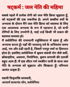 खैर, यदि शारीरिक स्वास्थ्य ही योग का लक्ष्य हो तो भी षट्कर्म बड़े महत्व का है। छह यौगिक क्रियाओं वाले इस यौगिक समूह को थोड़ा विस्तार से समझिए। धौति पट्कर्म की पहली क्रिया है, जिससे पाचन तंत्र को शुद्ध किया जाता है। आमाशय और अन्न नलिका की सफाई होती है। इससे कब्ज, अम्लता यानी एसिडिटी दूर होती है। इसे सामान्यत: कुंजल क्रिया के रुप में जाना जाता है। बस्ती क्रिया बड़ी आंत (मलाशय) की शुद्धि के लिए है। शंख प्रक्षालन इसकी प्रचलित विधि है। परमहंस् स्वामी निरंजनानंद सरस्वती इसे यौगिक एनिमा कहते हैं। इसी तरह वे नेति क्रिया को ईएनटी डाक्टर कहते है। क्यों? क्योंकि नेति क्रिया से नाक, कान और गले की सफाई हो जाती है और इनमें संबंधित बीमारियां दूर ही रहती हैं।