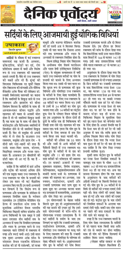 जाहिर है कि सर्दियों में हार्ट अटैक और स्ट्रोक की घटनाएँ अधिक होने की एक प्रमुख वजह उच्च रक्तचाप है। उच्च रक्तचाप पर योग के प्रभावों को लेकर इस साल भी कई वैज्ञानिक अध्ययन किए गए हैं। इन सभी अध्ययनों का निष्कर्ष है कि विशेष रूप से प्राणायाम और प्रत्याहार के संयोजन से रक्तचाप नियंत्रित रहता है। ग्लोबल एडवांसेज इन इंटीग्रेटिव मेडिसिन एंड हेल्थ में प्रकाशित शोध प्रपत्र के मुताबिक अमेरिका स्थित भारतीय चिकित्सा विज्ञानी सचिन प्रांजपेय और अन्य चिकित्सों के एक समूह ने इसी साल लगातार तीन महीनों तक के अध्ययन में पाया कि नियमित प्राणायाम और ध्यान के अभ्यास करने से उच्च रक्तचाप वाले रोगियों में रक्तचाप में स्पष्ट और स्थायी कमी आई। इसी साल एक दूसरा अध्ययन आंध्र प्रदेश के नांदयाल स्थित राजकीय मेडिकल कालेज की डॉ पी राजेश्वरी, डॉ सज्जा माधुरी और कडप्पा मेडिकल कालेज की डॉ रजनी आर ने मिलकर किया। इससे भी पता चला कि रोजाना आधा घंटे तक प्राणायाम और ध्यान के अभ्यासों से रक्तचाप नियंत्रित होता है।